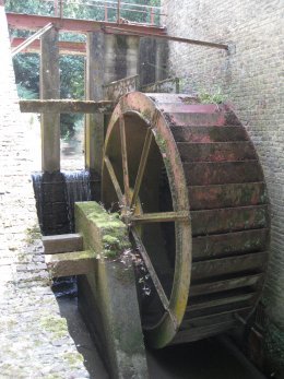 Bij de restauratie vernieuwd geklonken ijzeren waterrad met grote diameter (3,6 m). Afgeronde gemetselde asput. In de doorgang naast het metalen bovenslagrad (diameter 3,6 meter) maakt het water een val van 3,5 meter. Op de rechteroever is een bypass die eventueel als vismigratiedoorgang kan ingericht worden.