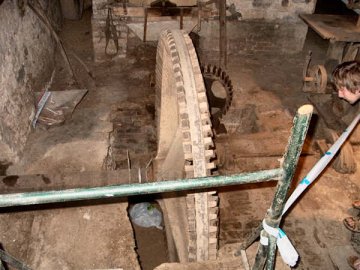 Twee asputten met een uitzonderlijk aantal radaren, het roerend werk kon zowel door het bovenslag- als door het onderslagrad in werking worden gezet. Tussen de twee asputten treft men een indrukwekkend overbrengingssysteem op een horizontale as.