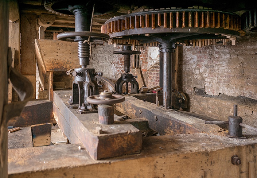 Er zijn drie koppels maalstenen: twee koppels La-Ferté en één koppel Jaspers. De stenen kan men opentrekken met een houten en een ijzeren galg. Er is een sleepluiwerk met aandrukrol op de lederen riem. Zoals bijna overal elders is het oorspronkelijk houten binnenraderwerk omstreeks de eeuwwisseling door gietijzeren overbrengingen vervangen. De sfeer van het oude ambachtelijke molennaarsvak is er nog volledig aanwezig.