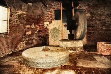 - Kollergang met nog 1 loper rechtop, ijzern steenspil en dito steenwiel, buil, restanten van de slagbank en de graankuiser kollergang met 1 loper