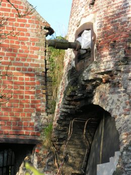 * stenen onderbouw van de slagbank => de kollergang werd op het laatste aangedreven op motorkracht vanuit de nabijgelegen schuur, maar de originele aandrijving is nog deels zichtbaar.