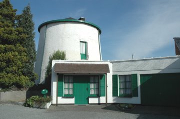 Deze stenen bergmolen heeft een vrij brede romp en was voorzien van een zetelkap met oversteek boven het kruiwerk.