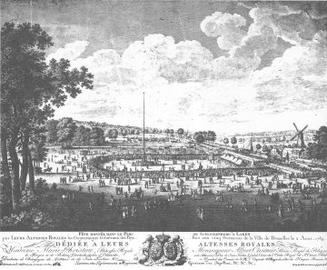 [1] Deze feesten waren in werkelijkheid begonnen op 25 juli en pasten in het kader van het jubileum van het “Sacrament van het Mirakel”. Op 2 augustus waren de twee eersten die schoten de prins Clemens van Saksen, aartbisschop van Trier en zijn zus Marie, abdes van de abdij van Thorn. (A. WAUTERS. Histoire des environs de Bruxelles. Livre 6 A. p. 174)
