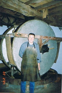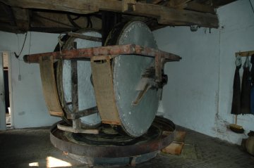 De kollergang met de twee loperstenen, elk goed voor een gewicht van 3.500 kilo. Met bovendien een diameter van 2m20 mogen we deze molenstenen als de grootsten van ons land beschouwen. Foto, W. Van den Branden.