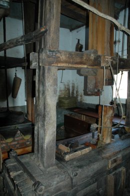 - Kollergang (2 lopers, arduin uit Ecaussinnes, diameter 2,3 m, dikte 30 cm, gewicht 3,5 ton elk), doodsbed (diameter 2 m, dikte 40 cm, gewicht 4 ton), vuister, eiken slagbank of persblok en heien, emmer-elevator, koppel linksdraaiende kunststenen (1,3 m) m