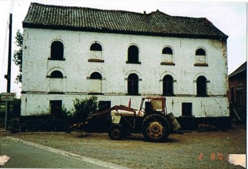 Cette façade ne laisse rien deviner de la structure qui lui correspond vers l'arrière. Curieusement, le volume aligné sur le cours d'eau, pourtant artificiellement relié au volume plus ancien, présente les mêmes caractères que le rehaussement dont celui-ci a fait l'objet: même alignement régulier des baies, même régularité dans les étages, mêmes baies cintrées sur des appuis saillants. Contrairement au second étage de la bâtisse établie sur la rivière (cas rare, il faut le souligner), celle établie en bordure de celle-ci est percée de baies à arc subaissé. Elle dispose en outre d'un haut grenier proncuté de petites ouvertures sous la corniche. Le pignon, côté aval, montre un ensemble de douze baies (actuellement murées) établies sur quatre niveaux. Des soubassements en pierre semblent indiquer que ce volume pourrait s'appuyer sur des base antérieures au 19e siècle.