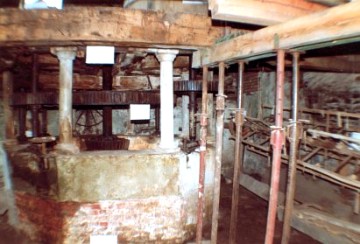 On remarque aussi des traces dans la façade, de l'agrandissement sur le côté du bâtiment. Au rez-de-chaussée, le puits du rouet est entouré d'une belle rotonde octogonale, système d'engrenages intact, bluterie et tarare de grande taille, élégantes colonnes en bois supportant les madriers des meules. Actuellement l'intérieur est encore assez vétuste, et les 4 paires de meules ont été déposées à l'extérieur. Le mécanisme est pratiquement complet et attend sa retauration.