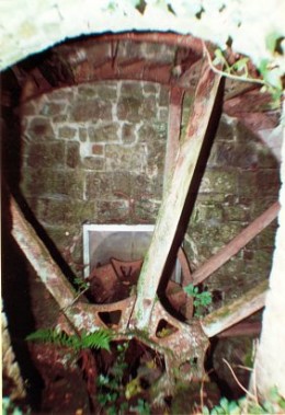 Vers la droite du moulin, bief conservant une vanne de pierre et la roue à aubes en bois.