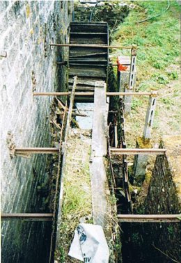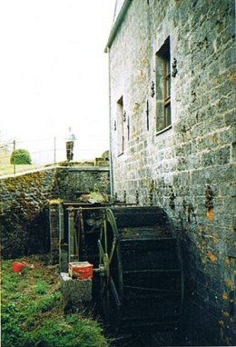 La roue métallique, quoiqu'assez dégradée, est toujours en place. Il en va de même pour le canal, fait de planches, qui amenait l'eau sur le sommet de la roue, type roue dessus.