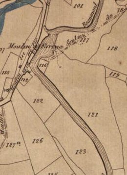 De precieze gegevens van de legger van Popp ca. 1860) geven aan: Sectie B nr. 114 - Moulin à eau à farine, eigendom van: De Riquet de Caraman, duc Victorien-Antoine, Paris.