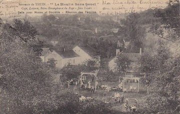De Moulin du Stordoir is, zoals zijn naam het aangeeft, een voormalige oliemolen, die voor 1700 werd gebouwd. De benaming Moulin de Sans Souci werd gegeven na de inrichting als ontspanningsoord. Een prentkaart van rond 1900 vermeldt: Souvenir de Thuin. Le Moulin Sans Souci. Café, Laiterie, Bières Etrangères et du Pays - Jeux Divers. Salle pour Noces et Sociétés - Réunion des Familles.