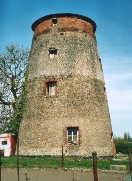Le moulin appartient à la catégorie des moulins à fût tronconique de maçonnerie. Il se distingue quelque peu par une allure qui tend à se rapprocher de la forme cylindrique. On peut distinguer, par la couleur des matériaux, trois étapes de construction qui aboutissent à sa physionomie actuelle. Une première étape associe le rez-de-chaussée et un étage. Des baies de petit gabarit, encadrées de montants de brique, éclairent parcimonieusement l'intérieur. Une deuxième étape correspond au deuxième étage. Les baies sont plus petites encore et sont percées aux quatre points "cardinaux". La troisième étape de construction, en brique et apparamment assez récente, correspond à un très probable rehaussement. Malgré la disparition de la toiture - remplacée par une plate-forme, le moulin garde intacte la totalité de ses maçonneries. Une corniche en encorbellement couvre encore le tout.