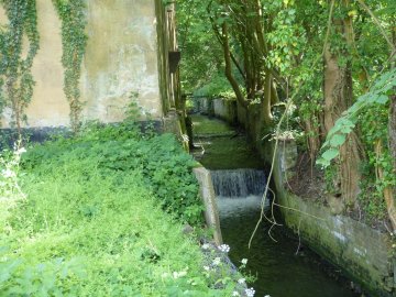 Een dreef met forse platanen brengt je langs een boomgaard en een hooiland tot bij de voormalige watermolen. Een eenvoudig volume, met een gelijkvloers en een dakverdieping onder oude houten spanten. Achteraan klettert het water langs de betonnen zijtak van de Molenbeek. Een paar overblijfsels van de molen zijn nog vaag herkenbaar. Even verderop de reusachtige vijver, groen van het kroos. De treurwilgen in en hangend over het water.