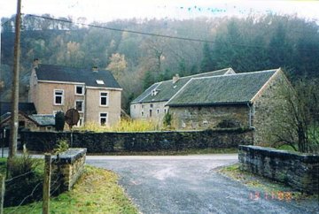 Sis dans un joli vallon en retrait de la route, l'ensemble comprend un logis, un moulin dont les constructions actuelles remontent au XVIIIe siécle et des dépendances des XVIIIe et XIXe siécles. En moellons de grés et de calcaire, le long bâtiment abritant le logis et le moulin desservis par une même et large porte, est éclairé par des baies rectangulaires sous une bâtiére à croupette. Actionnée par le bief canalisé, la roue métallique est fixée au pignon du mur. A l'intérieur, la machinerie et les meules sont conservées. L'ensemble est classé depuis 1983.