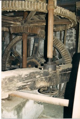 Op de onderste verdieping bevindt zich de gietijzeren overbrenging naar de drie steenkoppels. Ook zijn er meelgoten te zien van de steenkoppels, maar ook nog enkele goten van een verdwenen buil.