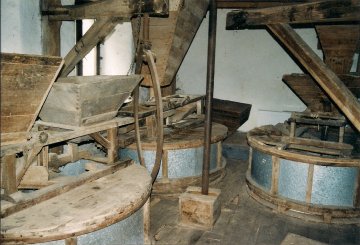 Op de eerste verdieping zien we drie steenkoppels. Het ene steenkoppel is compleet, maar het deksel van de steenkist is ingevallen. Het tweede steenkoppel heeft twee karen, het andere twee schuddebakken. Ook zien we de restanten van een graankuiser.