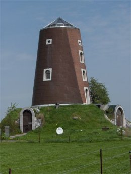 Les ailes n'existaient plus, soit. Mais il nous importait de maintenir les baies selon les quatre points cardinaux. A l'exception de la porte d'entrée, que nous avons percée dans la butte de 3,5 mètres qui l'entourait, nous nous sommes efforcés de lui laisser son âme. C'était, et c'est encore, le plus beau moulin de la région. Le plus haut aussi !