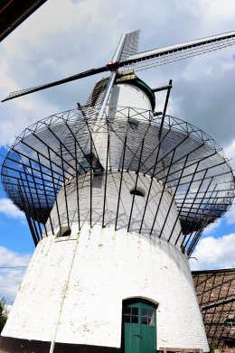 't Is een prachtige molen met 32 voeten galerij. Ze meet van de grond tot aan den band 72 voeten metselwerk, en met haar machtig kruis beheerscht ze de gansche streek.