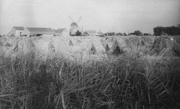 Foto 1. De Oude Zeedijkmolen na de stormramp: de kap is voor een klein gedeelte vernield, maar aan de as en de wielen is weinig schade.