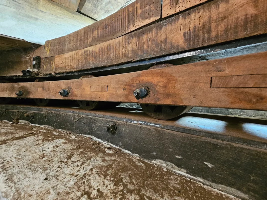 Uit de tijd van de staakmolen herinneren nog de molenijzers: het ene heeft als inscriptie "Nouviaire Fondeur en fer Bruges", het andere "P.D.L." en "1772". Ook de teerlingen van de staakmolen steken nog onder de huidige molenmuur!