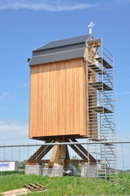 In juni 2012 werd als fundering een plateau in gewapend beton met vier rechtopstaande blokken gegoten. Na bekleding met metselwerk zullen deze blokken fungeren als teerlingen. Ondertussen wordt in het atelier van Wieme Molenbouw te Machelen (Zulte) de onderdelen van de nieuwe molenkast gemaakt. De montage en inrichting ter plaatse gebeurde in mei-juli 2013. Deze montage was een mooi combinatie tussen de oude en nieuwe manier. Net zoals vroeger werd de kast weeg per weeg opgetrokken (en dus niet in zijn geheel), maar werd gebruik gemaakt van een moderne hefkraan (en niet met een schalk of molenmakersgewan). Van de vroegere molen werden de askop (type Jos. en Aug. Van Aerschot, Herentals), de binnentrap, een ijzerbalk, enkele schoren in de zijwanden, een koppel molenstenen en de haverpletter opnieuw gebruikt. Op 17 juli 2013 werden de roeden ingetrokken.