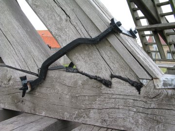 Opdracht: Herstel stormschade: vernieuwing vangbeugel en -plaat, verandering montagesysteem van de vang: gesmede as door de daklijst met haak door de vangplaat (in plaats van de gebroken vangbeugel)