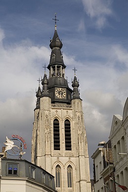 In de houten spits hangt een beiaard van 49 klokken. De beiaard, in 1886 vernieuwd door Van Aerschodt (Leuven) werd grondig bijgewerkt en hersteld in 1973-1974. Al deze vrachten werden met de tredkraan omhoog getakeld.
