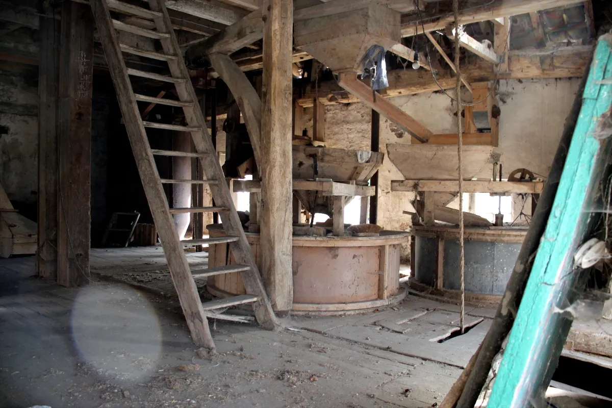 Binnen zien we in de asput de wateras en de koning. Het gietijzeren aswiel en het sterrewiel zitten nog steeds ter plaatse. Aan de onderkant van de koning is duidelijk een breuk te zien. Door die breuk is de maalactiviteit op waterkracht gestopt. Het spoorwiel drijft vijf kleinere assen aan. Drie van die assen gingen naar de koppels stenen. Een vierde drijft een elevator aan en een vijfde dreef een vijfde as aan die onder andere naar de trieur ging.