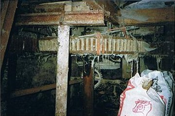 Op deze as naar de trieur zitten verschillende drijfriemen om de elevator, de trieur en eventueel andere apparaten aan te drijven. Daaronder zien we nog een andere as zitten, die leidt naar de volgende ruimte en één koppel maalstenen In die ruimte bevond zich een elektromotor om dit koppel na de asbreuk aan te drijven. Bij een controle van monumentenwacht werd vastgesteld dat de elektromotor niet bij de beschermde molen hoort. Vervolgens werd de molenaar verplicht deze elektromotor te verwijderen. De man laat door dit voorval maar weinig mensen bij zijn molen.