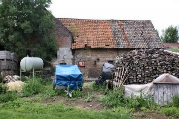 Recent gebouw (cementblokken) onder golfplatendak vervangt de vroegere schuur, ten noorden van het erf (1852).