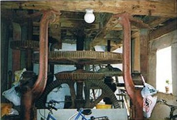 - Overdekt, groot, ijzeren waterrad (middenslagwiel gietijzeren hart, massieve spaken) op stalen as, tussen natuurstenen muren.