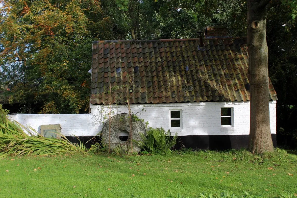 In de zuidwestelijke hoek het oorspronkelijk 17de-eeuwse molen- en molenaarshuis op rechthoekige plattegrond dat in de loop van de 19de eeuw aan beide zijden werd ingebouwd tot een L-vormig volume onder complexe pannen zadeldaken. Opgetrokken uit breuk- en baksteen met gebruik van witte natuursteen voor de hoekkettingen, deur- en vensteromlijstingen. Bakstenen erfgevel op breukstenen onderbouw met sporen van hoekkettingen, rondboogpoort met afgeschuinde dagkanten en twee kleine venstertjes met kwarthol profilering en vooruitspringende latei. Groot houten laadvenster onder sterk overkragend zadeldak met houten vleugeldeur. Poort met vernieuwd metalen en beglaasd schrijnwerk. In de oksel een uitspringend breukstenen constructie op vierkante plattegrond met aangepaste rechthoekige openingen. De gevel aan de beekkant bevat nog restanten van een breukstenen parament. Ter hoogte van het molenhuis rechthoekige deur met kwartholle stijlen en negblokken, twee kloostervensters en hoekkettingen. Ter hoogte van het woongedeelte aangepaste rechthoekige vensters onder arduinen lateien (cf. foto 1972: houten lateien) en ijzeren hekjes. De westelijke zijgevel was oorspronkelijk een topgevel en werd vermoedelijk bij de bouw van het aanpalende haakse volume (1840) aangepast tot lijstgevel. Sporen bewaard van een breukstenen parament en vlechtingen; behouden rechterschouderstuk met deksteen en een voormalig beluikt topvenstertje in zandsteen. Later aangebrachte deuropening.