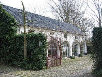 Ten oosten van het erf bakstenen karrenhuis van vijf op twee traveeën en anderhalve bouwlaag onder pannen zadeldak, nok loodrecht op de straat. Geritmeerd door rondboogarcaden op vierkante pijlers, ingevuld door beglaasd ijzeren schrijnwerk. Straatgevel met blinde rondboogpoort. In het verlengde van de achtergevel is de bakstenen muur met rechthoekige poort nog een restant van de gesloopte schuur.