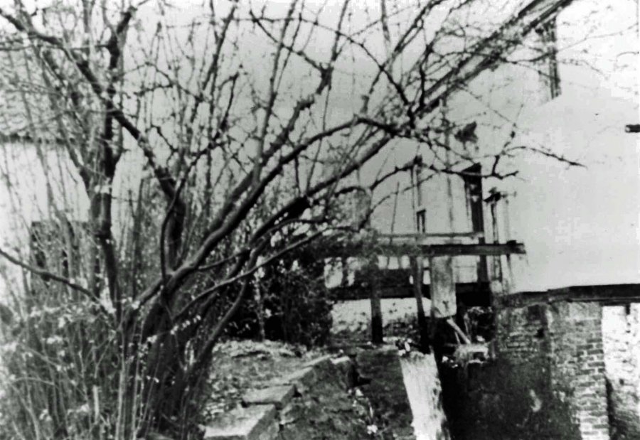 het bijgebouw links op de foto toen nog helemaal recht stond. Toen wij de molen kochten in 1977 bleef er slechts een puinhoop over. Wij hebben dat gedeeltelijk heropgebouwd.