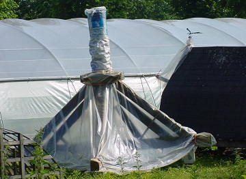 In de serre zien we de gedemonteerde trap liggen. De treden zijn wel verwijderd. De staart staat ernaast. In de serre staan ook de gelaste roeden (nagebouwd in hout) en het houten hekwerk. De roeden zijn doorgezaagd, maar het oorspronkelijke hekwerk is nog aanwezig. Voor een kleine staakmolen is dit hekwerk nog redelijk zwaar.