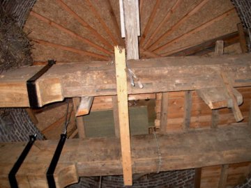Wandelen we verder richting ingang van het woonhuis passeren we de voet van de balie- of stellingmolen.