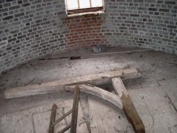 Binnenin treffen we een ruime opslagruimte aan met trappen die ons spiraalgewijs naar de boven gelegen verdiepingen brengen.