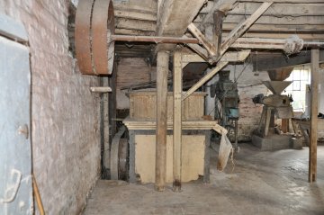 - traditonele maalstoel met twee molenstenen van ongeveer 1500 kg elk. De loper draait ongeveer 125 toeren per minuut