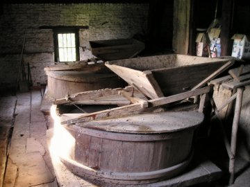 Maalvloer: rust op zware houten constructie. Archaïsche frontale opstelling; twee koppel stenen, van 1,40 meter doorsnede, inschakeling en lichten gebeurt door middel van een hefboom. Alle toebehoren zijn in hout en integraal bewaard; viertakse rijnen.