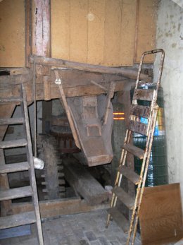 Hulpwerktuigen: builinstallatie. Steenrepen in plaats van galgen; worden getrokken over een as en een wielsysteem in hout. Binnenluiwerk en houten klauwwiel manueel aangedreven.