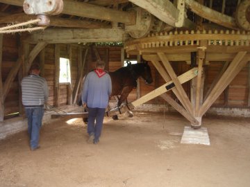 Het is een houten rosmolengebouw waarbij het paard binnen loopt.