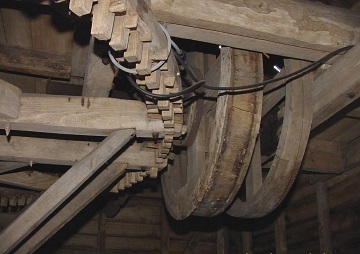 In het midden draait, op een blauwe natuursteen, de spil die boven aan de ankerbalk bevestigd is; aan de bovenkant van deze spil is het kroonwiel gemonteerd. Op de spil en op een verbindingsbalk staat het jaartal 1861. In de spil komt een inkeping voor die verband houdt met de trekboom waaraan het binnen in de molen lopende paard gespannen was. Het groot wiel is opgebouwd met een kruis met dubbele armen die door verbindingsbalkjes verstevigd zijn en de spil goed omsluiten; daarenboven wordt het wiel gesteund door twaalf schoren tussen de rand van het wiel en de onderkant van de spil. Het kroonwiel heeft buitenwerks een diameter van 3,38 meter en telt 126 kammen die haaks op de rand staan.