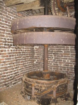 De molen heeft herstelling nodig. De turbine, een koppel molenstenen en ander binnenwerk zijn nog aanwezig.