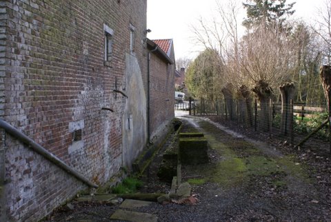 Ten oosten, molenhuis van witgekalkte baksteen, één bouwl. onder zadeldak (Vlaamse pannen), gedateerd [1]652 door middel van ankers in de erfzijdegevel. Erfzijdegevel met opgeklampte rondboogdeur in een vlakke, kalkstenen omlijsting met negblokken, waarboven een laadvenster onder zadeldakje; rechts van de deur, rechthoekige deur- en vensteropeningen (19de en 20ste eeuw). Voorgevel volledig verbouwd in de 20ste eeuw (vier traveeën); twee rechthoekige vensters, een vernieuwd rondboogdeurtje met mergelstenen omlijsting, waarboven het wapen van een abt van St.-Truiden, en rechts ervan een recent kruiskozijn.