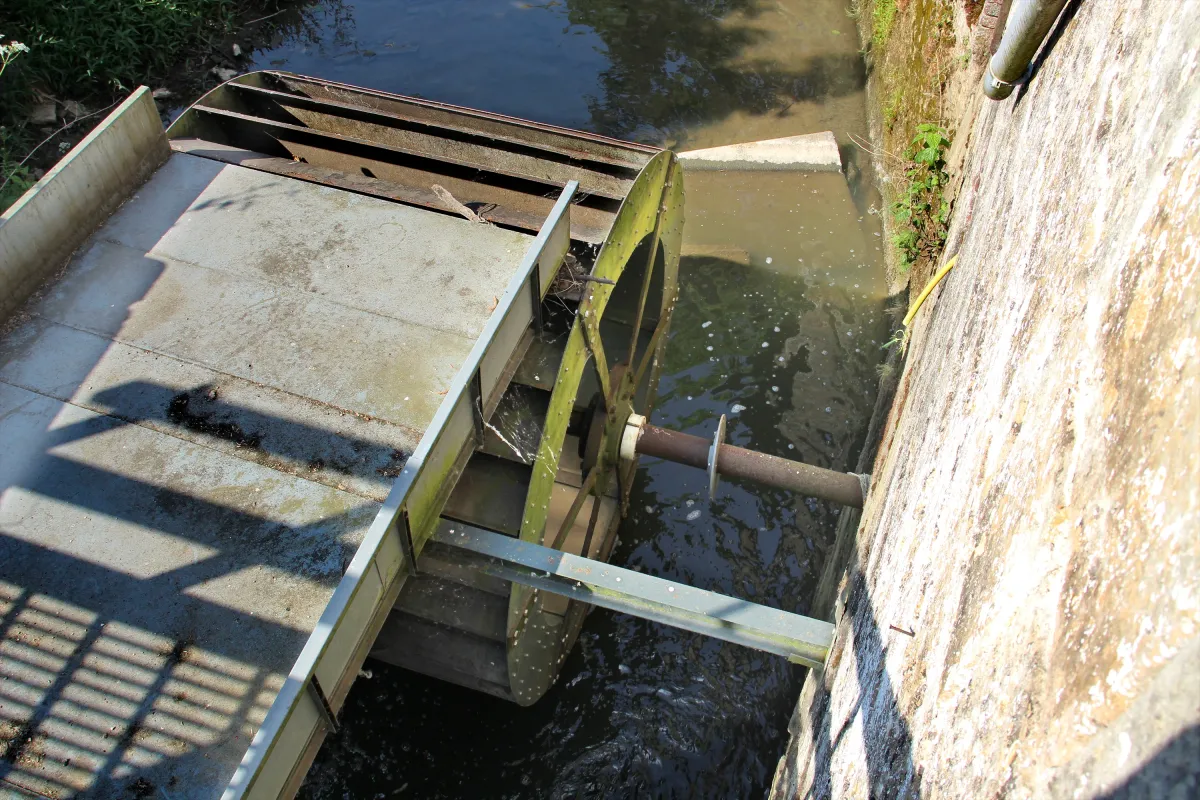 Van het metalen bovenslagrad (diameter 2,30 m) resteren nog enkel de verroeste velgen. In de jaren 1990 werd een nieuw rad gemaakt door leerlingen van het VTI. De molen is aan de waterkant goed zichtbaar van op de openbare weg en verdient, ook omwille van het nog aanwezige interieur (met de aantoonbare technische evolutie) een wettelijke bescherming als monument.