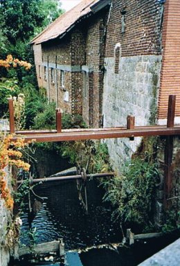 - Natuur- en bakstenen gebouw, dwars op de waterloop