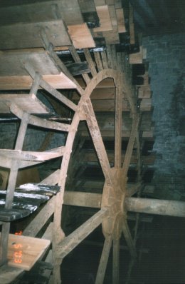 La roue à aubes se trouve à l’intérieur du bâtiment, et le Bocq (la rivière) anime l’ensemble de la machinerie par en-dessous.