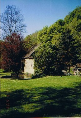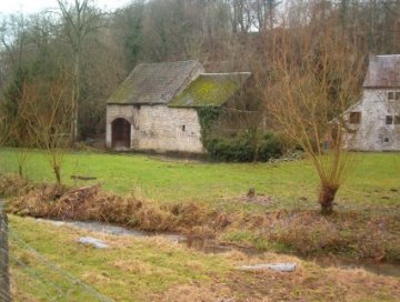 Une pièce d’eau, établie côté rue, rappelle néanmoins le bief d’un des plus vieux moulins du village, comme l’atteste sa première mention en 1495. De l’autre côté du chemin, une ferme en long, datant de la première moitié du 18e siècle, s’est établie au pied du versant. Haute de deux niveaux et peu profonde, elle correspond au volume typique du Condroz. Son corps de logis, en moellons de calcaire, comporte deux travées de baies à meneau asymétriques dont une, disposée à droite au rez-de-chaussée, qui a été rectifiée au 19e siècle. La porte d’entrée, quant à elle, présente un linteau droit posé sur des montants ou piédroits à queues de pierre et surmonté d’une petite niche en mitre. Dans le même volume, une étable sous fenil prolonge l’habitation sous une bâtière d’ardoises entièrement rénovée.