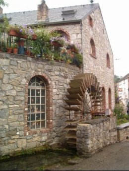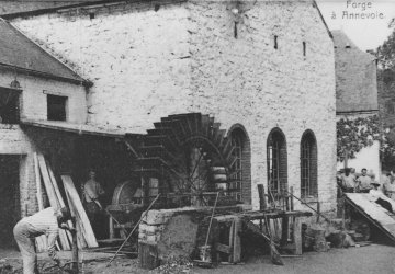 Deze watermolen werd pas in 1855 opgericht als ijzersmeedmolen (atelier Pirson). Er bestaat nog een prentkaart waarop we zien hoe het waterrad een slijpschijf aandrijft.