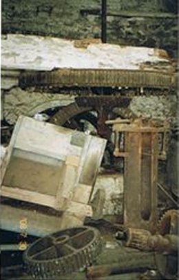 Il a conservé le mécanisme à engrenages à roues dentées et à l'étage, on peut voir une paire de meules.